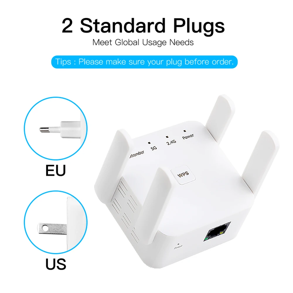 There are two Versions , one is 5G 1200Mbps Repeater With 4 Antennas, and the other is 2.4G 300Mbps Repeater With 2 Antennas.Please choose carefully