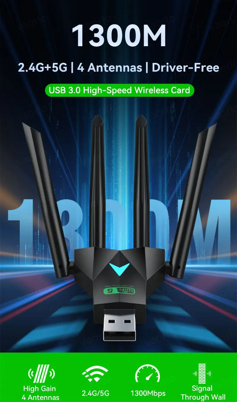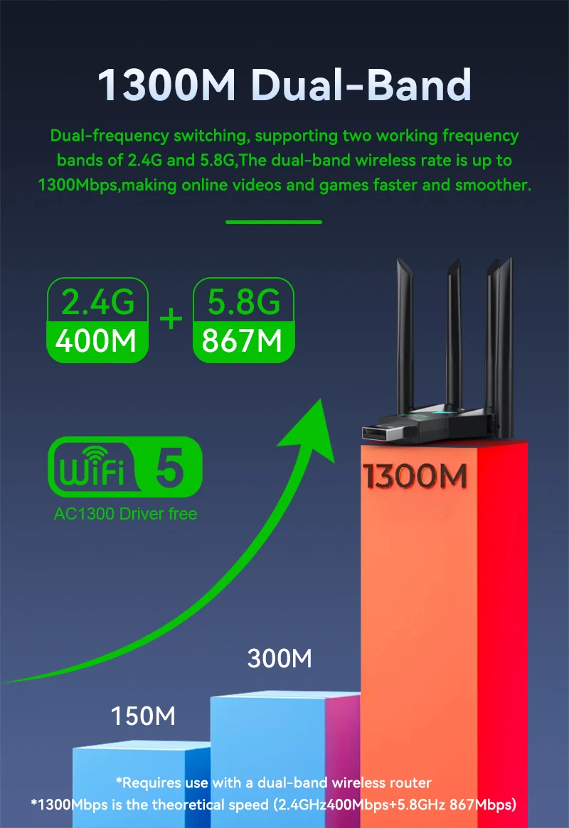 • High-Speed Wi-Fi :Experience seamless internet connectivity with this dual-band Wi-Fi USB adapter, offering a speed of 1300Mbps.Ideal for PC/laptop users.