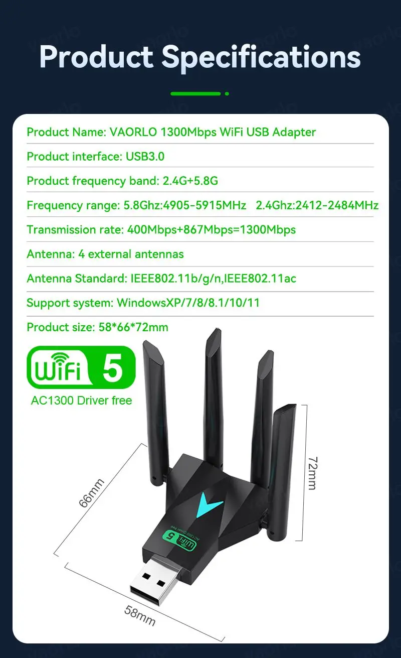 Product Name: VAORLO 1300Mbps WiFi USB Adapter