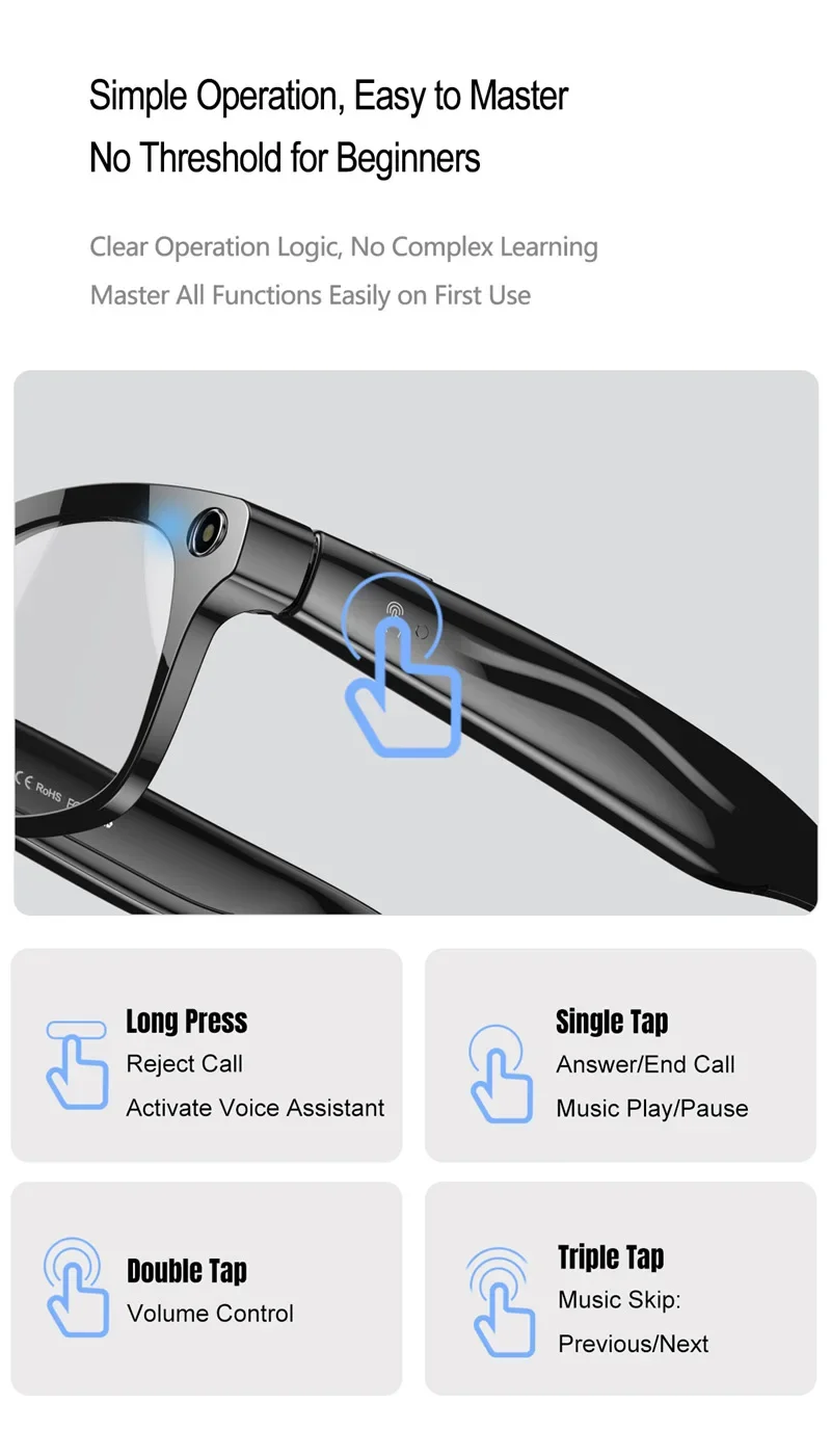 Main Features: AI voice assistant/photo taking/video recording/audio recording/music control/calling/alert sounds/indicator lights/translation/object recognition/touchscreen/music playback (music control, local music) etc.