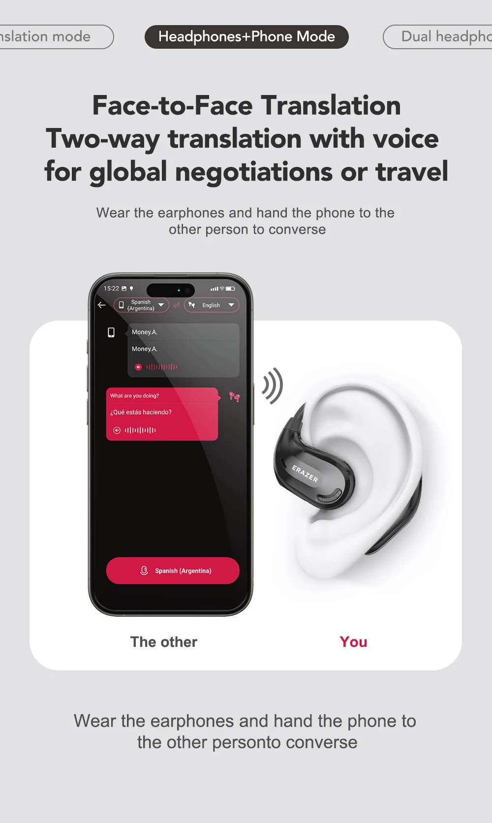 One side wears a headset and the other side holds a cell phone, andwhen the other side speaks a foreign language, the headset translatesinstantly.