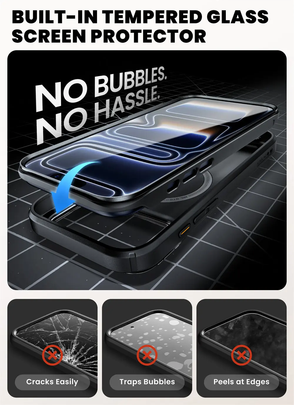 [9H Tempered Glass Screen Protector] Built-in ultra-clear tempered glass screen protector protects the screen from scratches and cracks while maintaining full touch sensitivity and maximum light transmittance.
