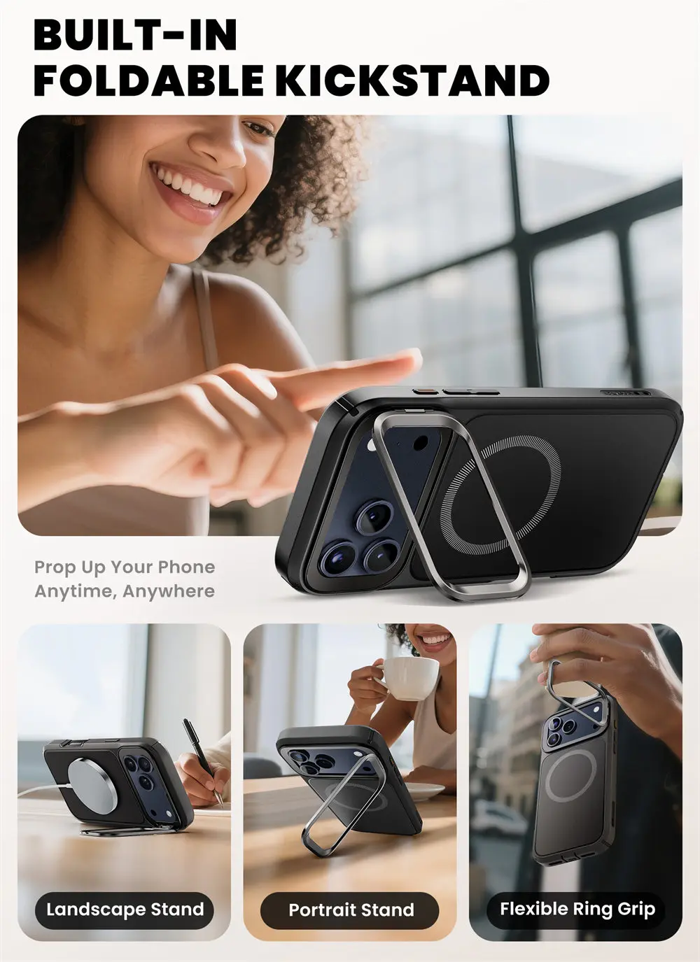 [Built-in Stand Features] Zinc alloy anodized camera stand offer multiple viewing angles and supports handheld grip mode for shooting while doubling as a ring holder.