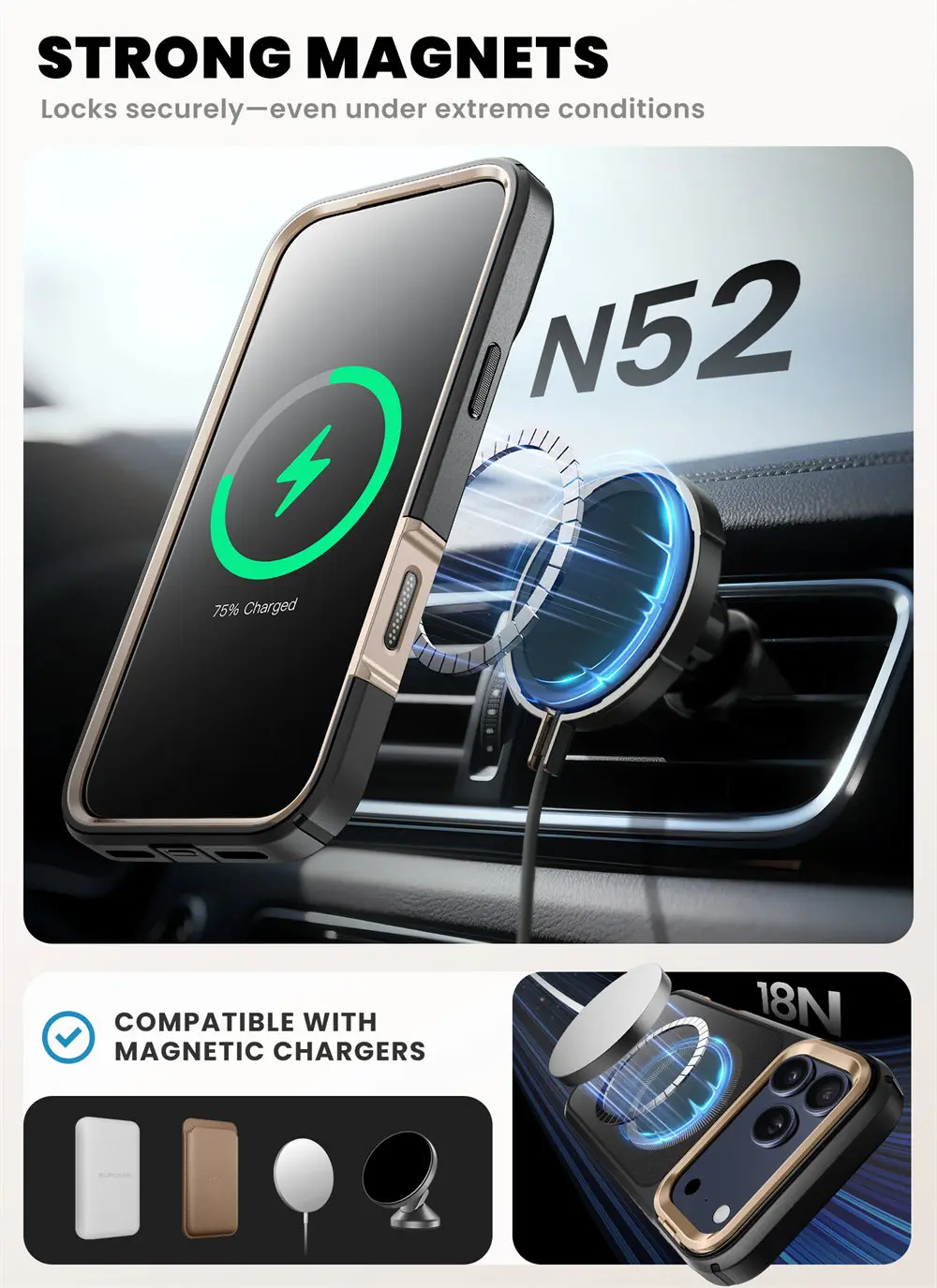 [Enhanced Magnetic Strength] Built-in N52 magnet provides up to 1800g of magnetic force, ensuring seamless compatibility with MagSafe accessories such as magnetic car mounts, wireless chargers, magnetic card holders, and desktop charging stands.