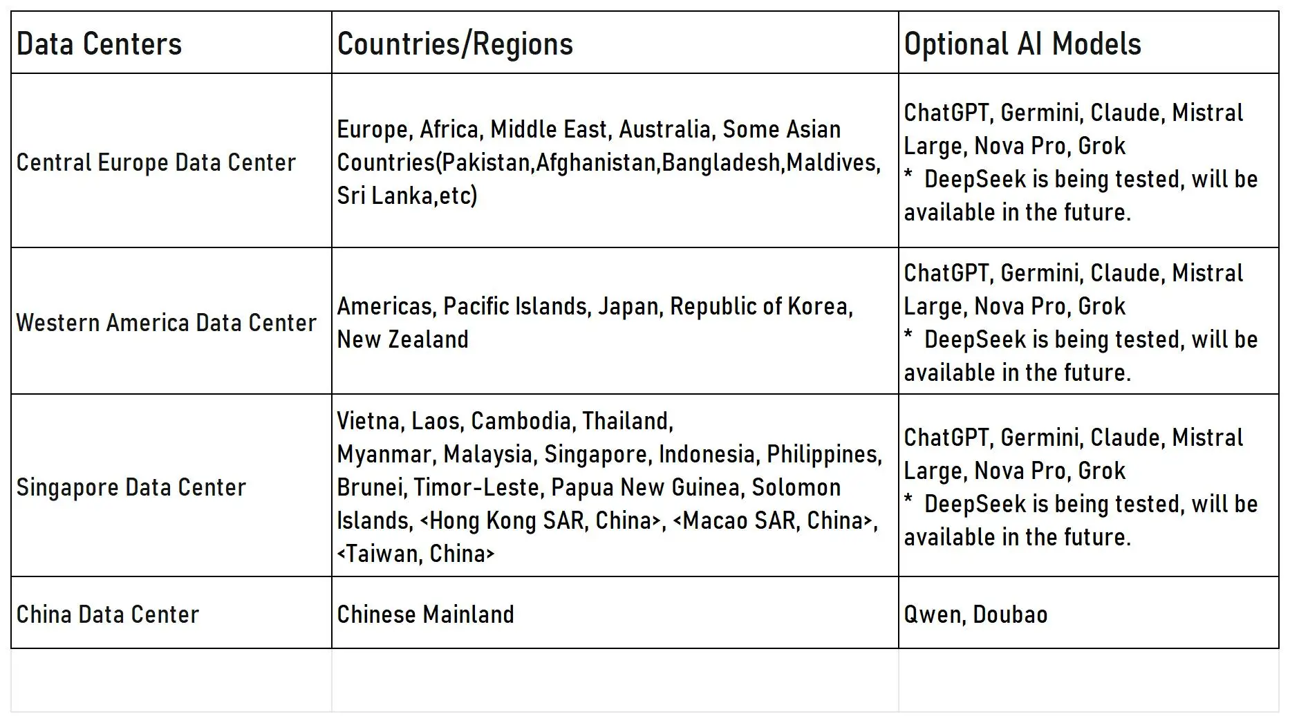 - Including ChatGPT, Germini, Claude, Mistral Large, Nova Pro, Grok, Qwen, Doubao, Deepseek, etc. - The optional AI models may be different in different countries/regions. * DeepSeek is being tested, unavailable for now, but will be available in the future.