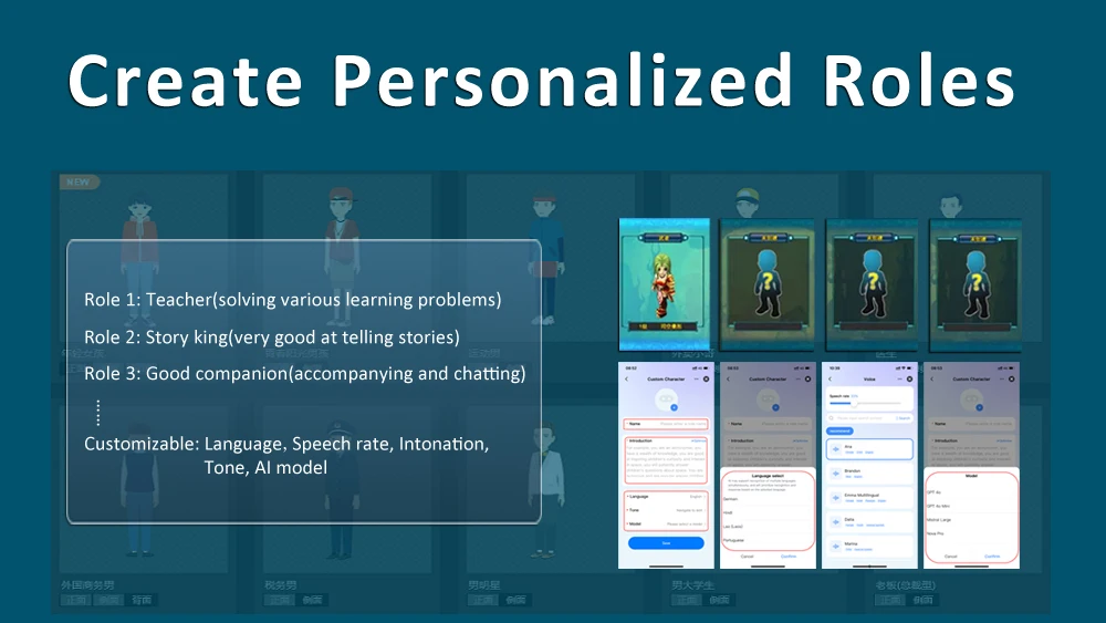 Role 1: Teacher(solving various learning problems) Role 2: Story king(very good at telling stories) Role 3: Good companion(accompanying and chatting) ...... Customizable: Language, Speech rate, Intonation, Tone, AI model